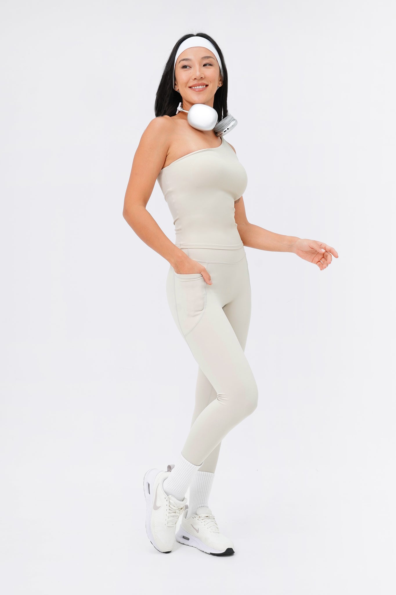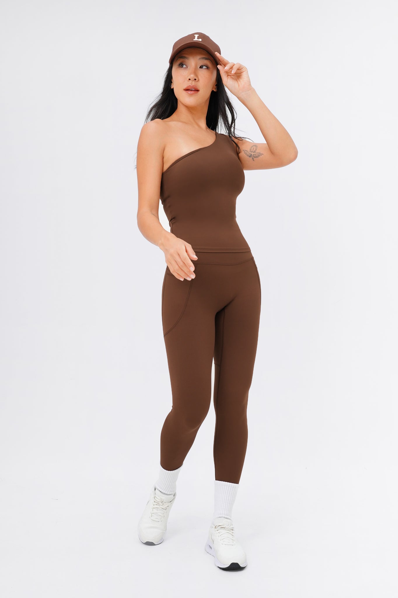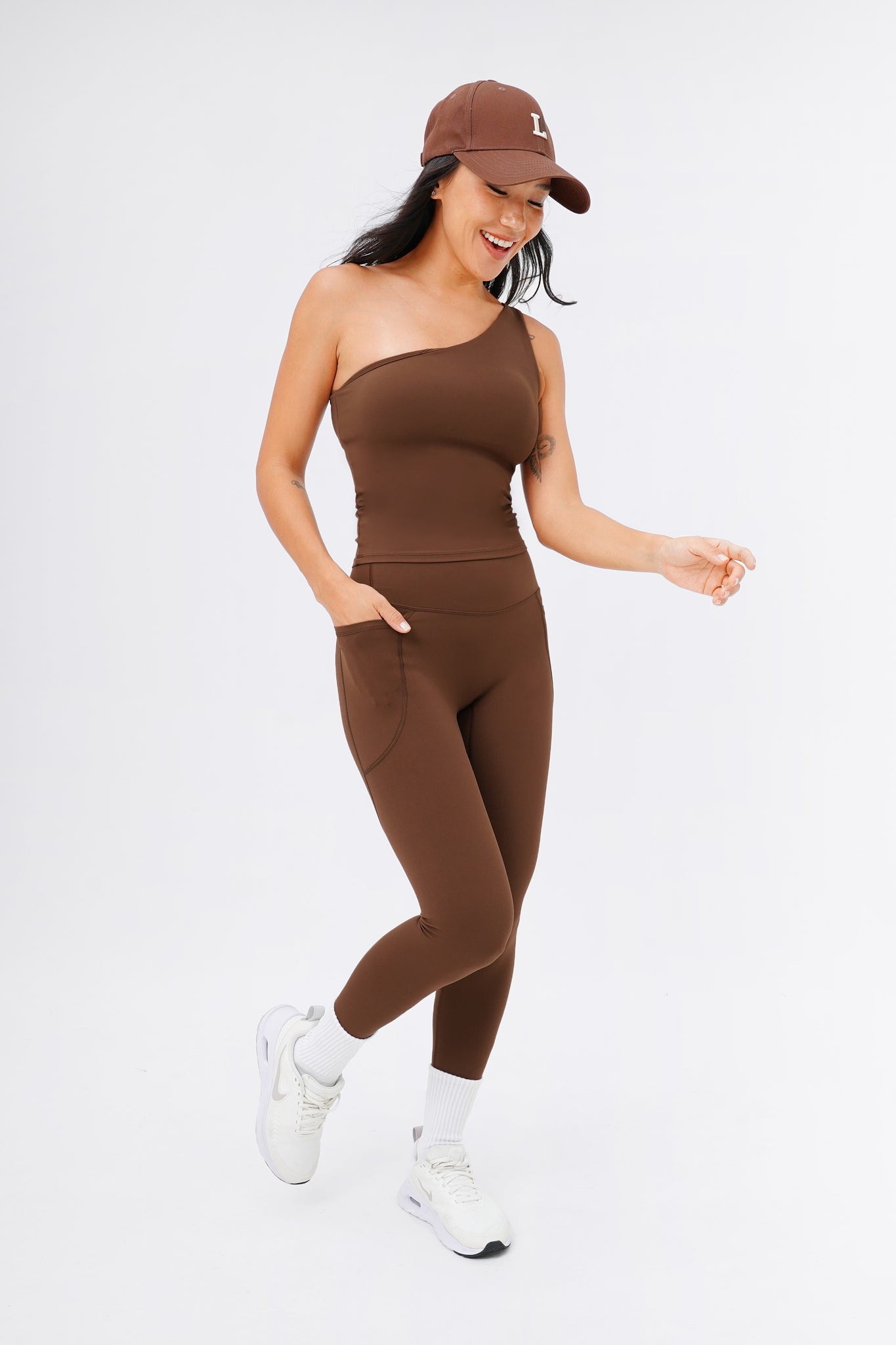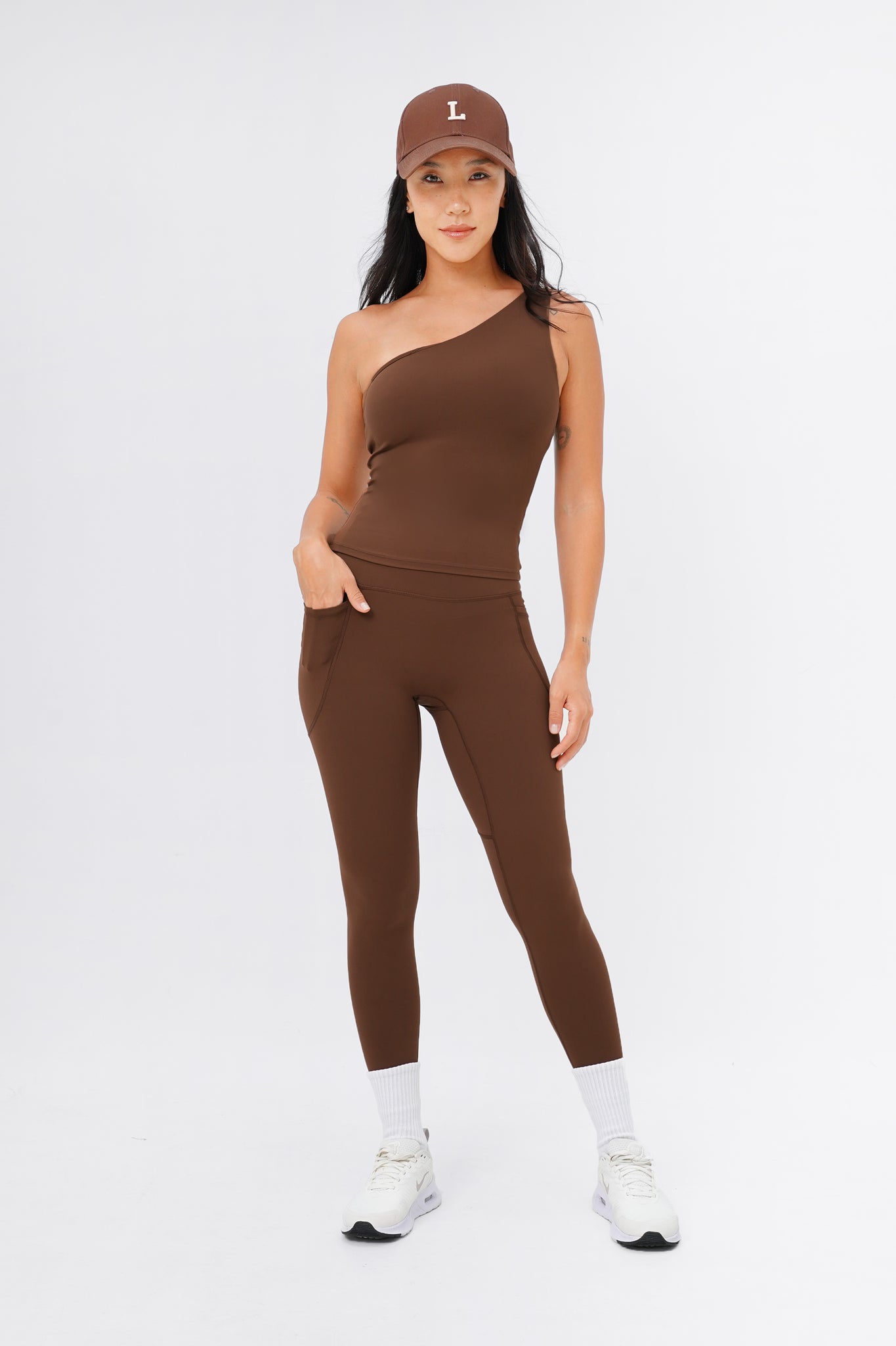 Sporty and sophisticated– meet the trendiest set for your next Pilates session! This seamless, one-shoulder silhouette makes a statement whether you wear it out in a matching set or dressed down for a casual street look. Comes with Sweet Dreamer One Shoulder Bra Tank in light support and Sweet Talker Pocket Leggings that is uber sculpting and compressive. This set is perfect for pilates, hot yoga, hard classes and everyday loungewear.